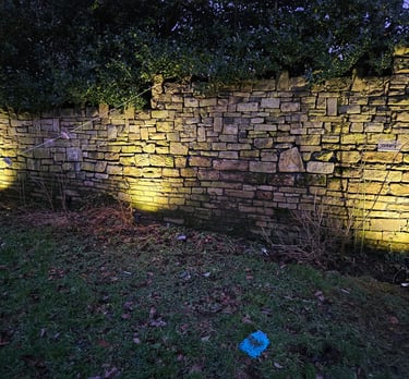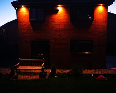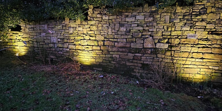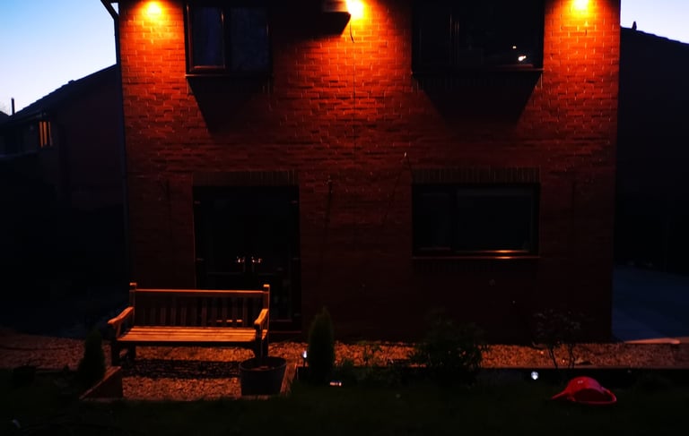 We were asked to install new LED soffit downlights around this property, switching from inside the building. As well as this, we installed some new LED garden lighting to light up their amazing stone walls. This was operated by a photocell, creating a feature of the wall effortlessly and efficiently as well as a a great atmosphere when the sun has gone down.